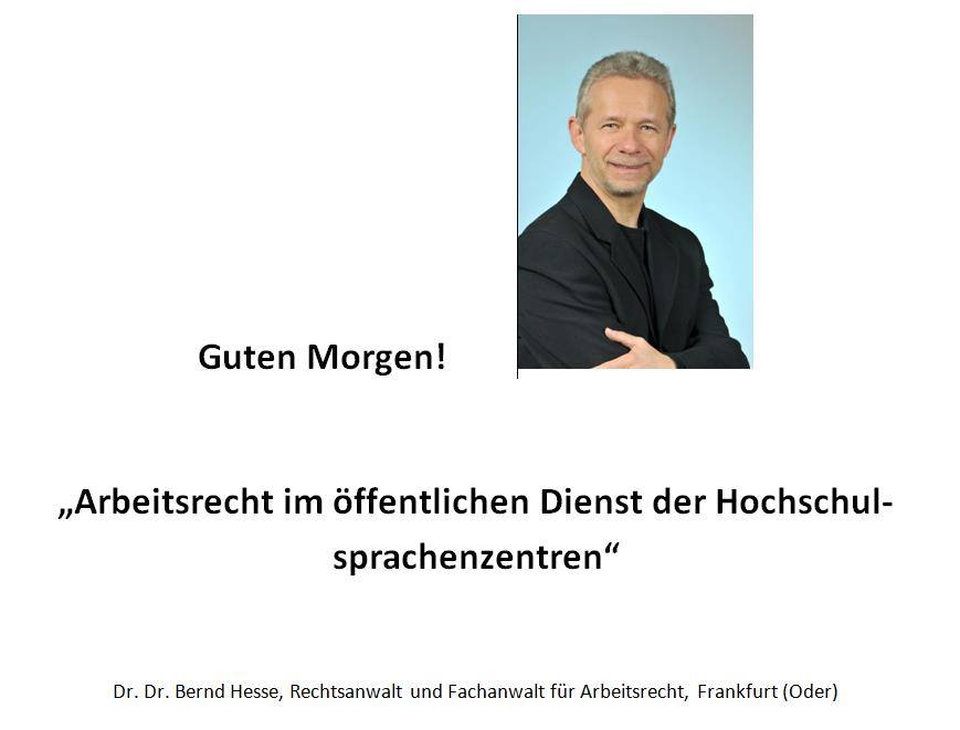 Neben diesen Lehr- und Fortbildungsveranstaltungen besucht RA Hesse selbst viele Vorträge und Veranstaltungen zu arbeitsrechtlichen Themen. Der Deutsche Arbeitsgerichtsverband und die Juristische Gesellschaft Frankfurt (Oder) - deren Mitglied er ebenfalls ist - bieten in Zusammanarbeit mit der Europa-Universität Viadrina seit Jahren öffentliche Veranstaltungen zum Arbeitsrecht an, die Rechtsanwälte Hesse und Hoff regelmäßig besuchen.